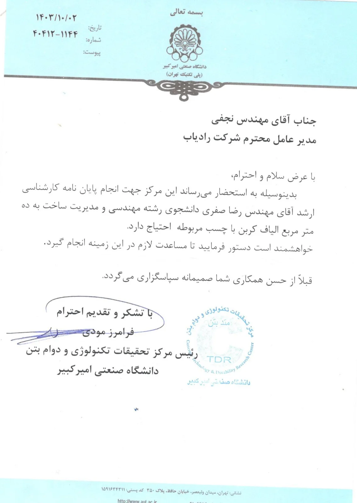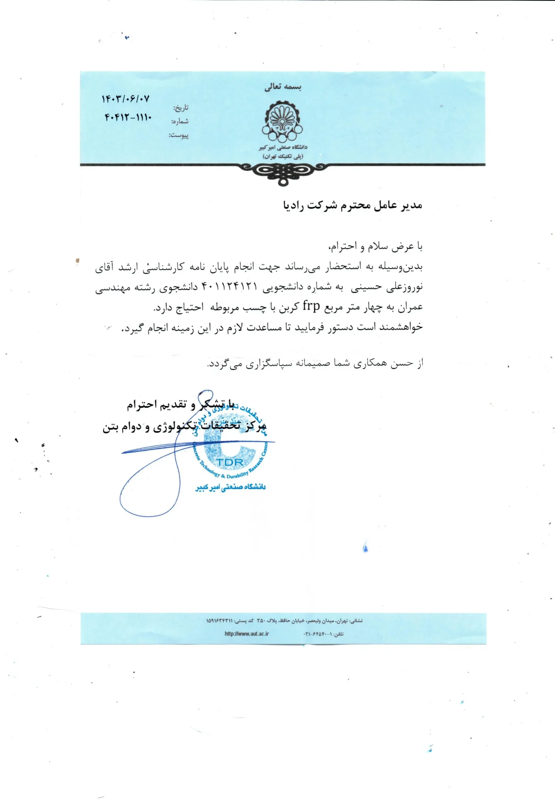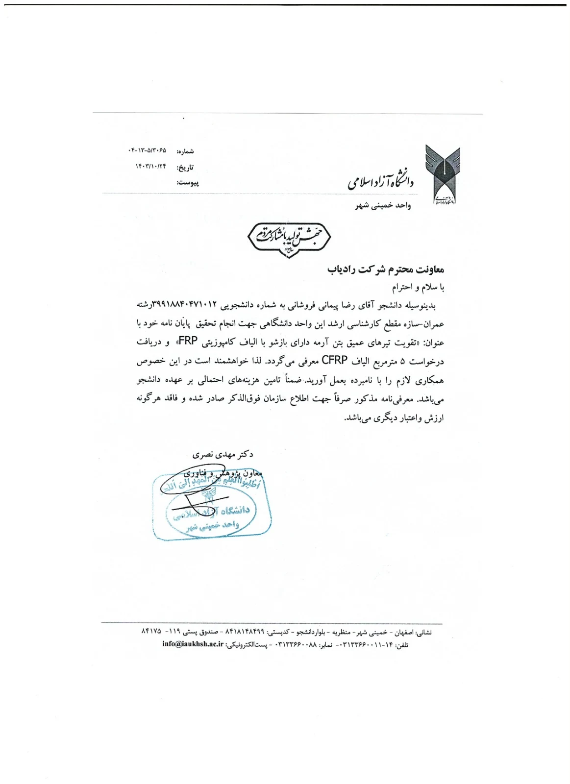 شرکت رادیاب با دانشگاههای مختلف کشور در پروژههای تحقیقاتی، پایاننامههای دانشجویی و طرحهای آزمایشگاهی مرتبط با مصالح FRP همکاری دارد. این همکاری شامل تأمین نمونههای FRP، ارائه اطلاعات فنی، مشارکت در انجام آزمایشها، و پشتیبانی از پژوهشهای مرتبط با رفتار سازهها و طراحی بهسازی لرزه ای است. ما تلاش می کنیم با تسهیل دسترسی دانشجویان و پژوهشگران به مصالح استاندارد و تجهیزات لازم، نقش مؤثری در توسعه پژوهشهای دانشگاهی و ارتقای سطح علمی کشور داشته باشیم. در ادامه نمونه هایی از همکاری با دانشگاه های کشور ارائه می گردد.