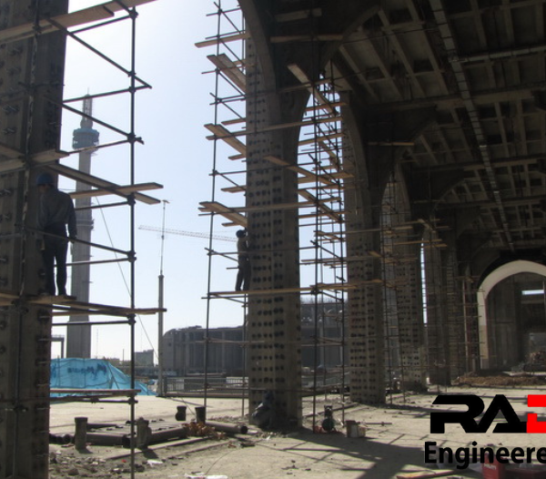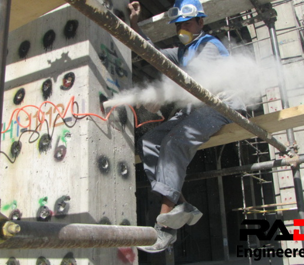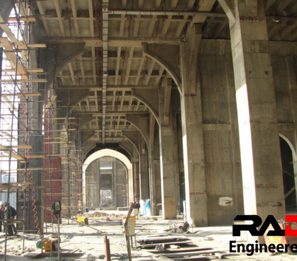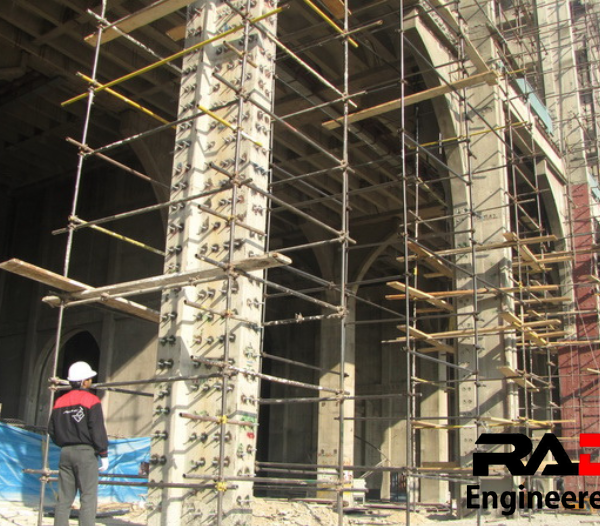 ستونها عمدتا به روش ژاکت فولادی (Steel Jacketing) تقویت شده اند. برای اجرای این روش بیش از 100,000 مورد سوراخکاری و کاشت انکر بولت و میلگرد انجام شده است. برای این منظور ابتدا تمامی ستون ها توسط دستگاه های دقیق اسکن شده و قبل از عملیات سوراخ کاری آرایش آرماتورها مشخص شده است.