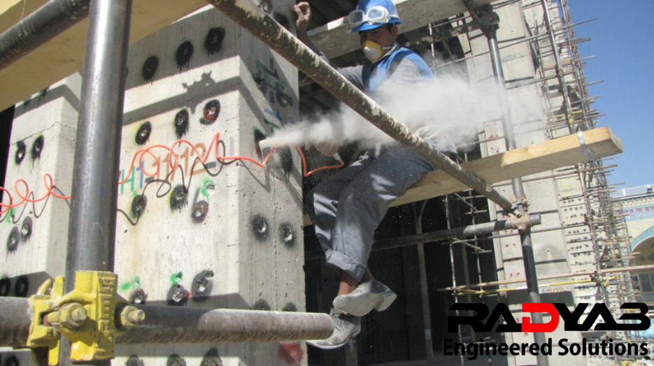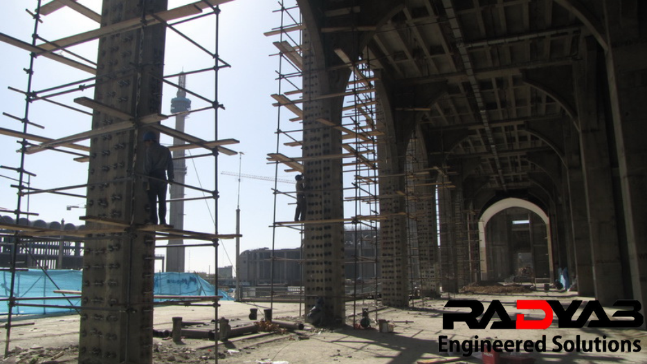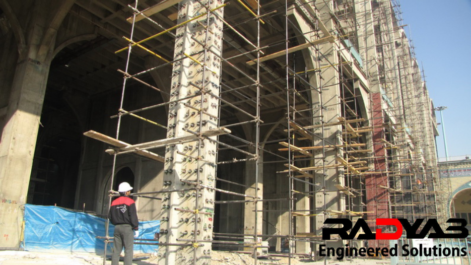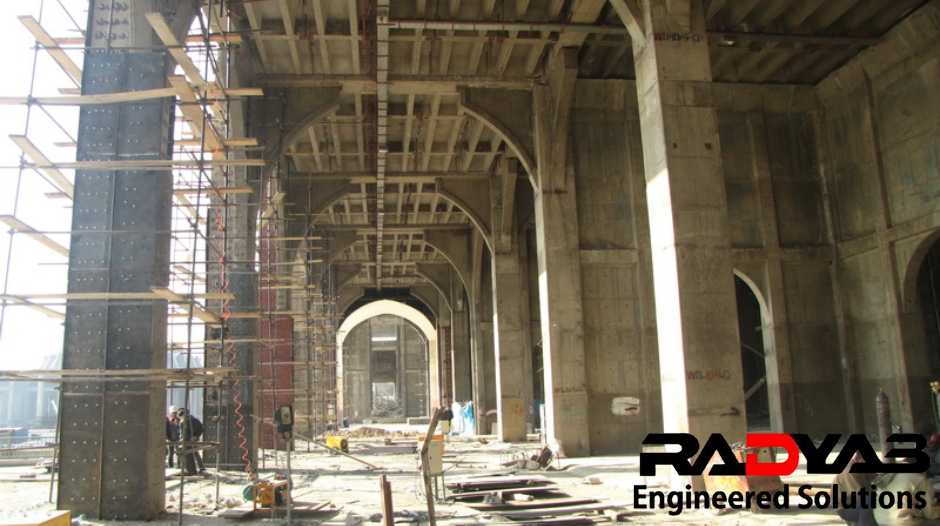 ستونها عمدتا به روش ژاکت فولادی (Steel Jacketing) تقویت شده اند. برای اجرای این روش بیش از 100,000 مورد سوراخکاری و کاشت انکر بولت و میلگرد انجام شده است. برای این منظور ابتدا تمامی ستون ها توسط دستگاه های دقیق اسکن شده و قبل از عملیات سوراخ کاری آرایش آرماتورها مشخص شده است.